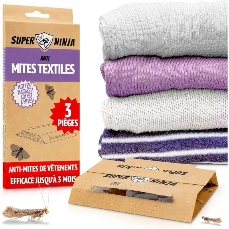Ces pièges englués anti-mites textiles attirent et capturent les mites mâles grâce à une phéromone naturelle. Sans toxines et inodores, ils protègent vos vêtements de laine, soie et coton pendant 3 mois. Discrets et faciles à poser dans armoires et dressings. Étui de 4 pièges.