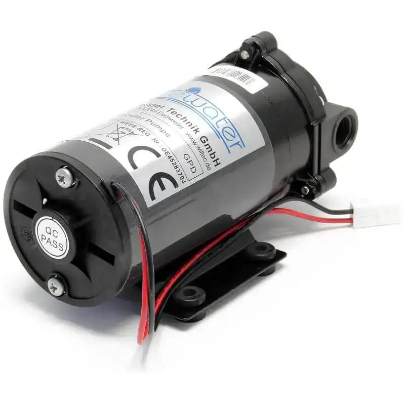 Pompe de surpression 24V pour osmoseur domestique. Optimise la pression, augmente le rendement en eau pure et améliore la performance de la membrane.
