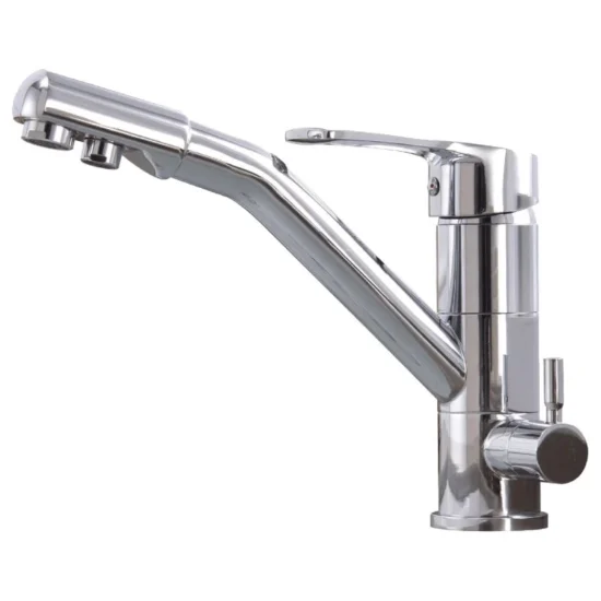 Robinet de cuisine 3 voies chromé avec bec rotatif 360°. Permet de distribuer l’eau chaude, froide et filtrée à partir d’un seul robinet. Installation simple sans perçage. Idéal pour les systèmes de filtration sous évier ou osmoseur.