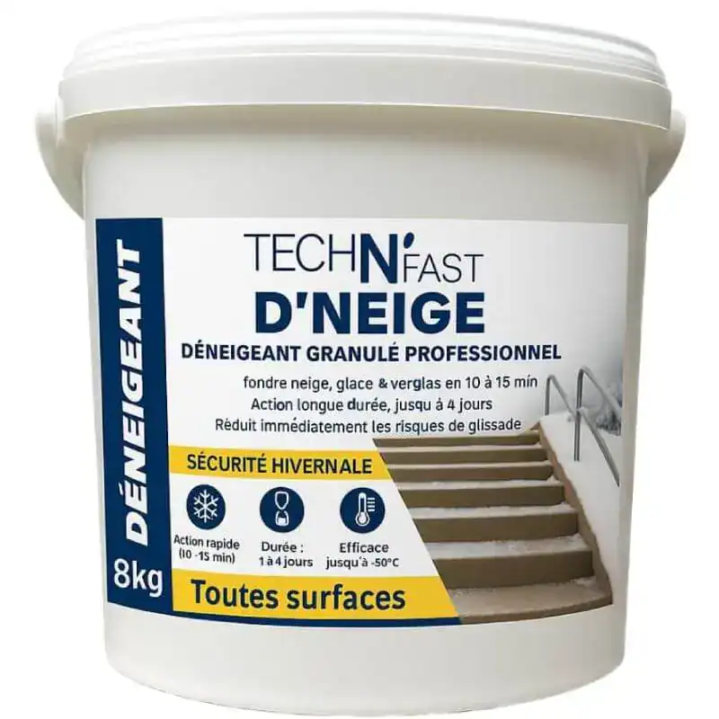 Le seau de déneigement au chlorure de calcium 8 kg agit en 10 à 15 minutes et reste actif jusqu’à 4 jours. Efficace jusqu’à -50°C, il fond rapidement la neige et le verglas sans danger pour les enfants ni les animaux. Granulés faciles à étaler pour trottoirs, allées et entrées.