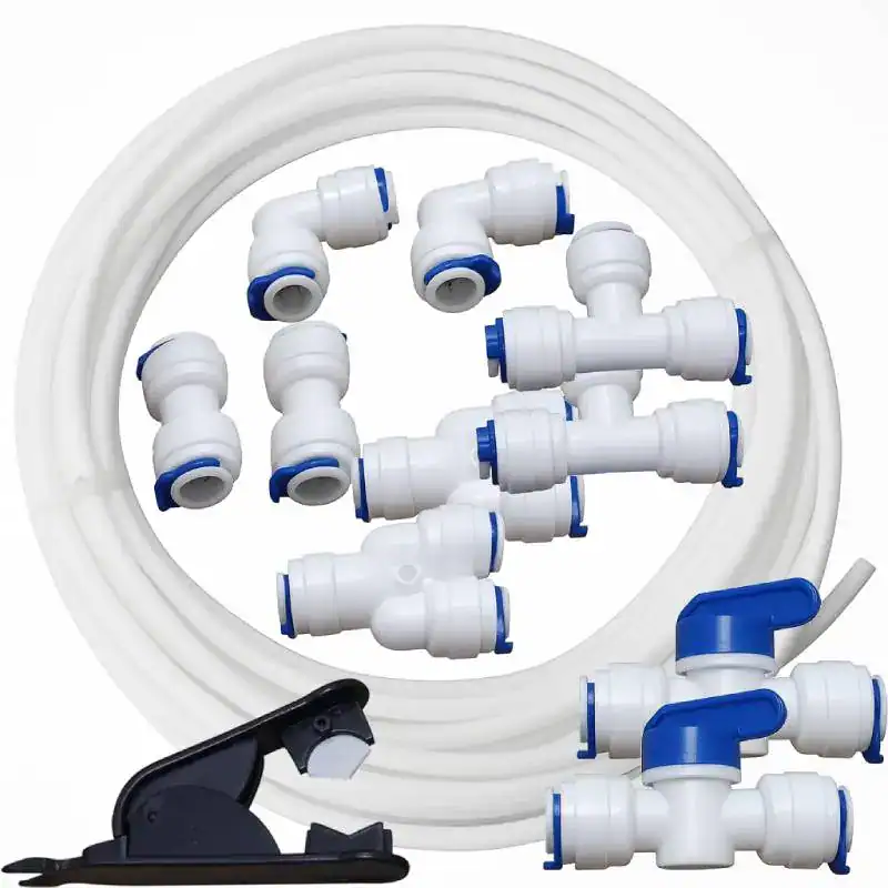 Ce kit complet 3/8 pouce comprend 5 mètres de tube alimentaire blanc en polyéthylène et 10 raccords rapides de haute qualité. Idéal pour les systèmes d’osmose inverse, purificateurs d’eau ou fontaines, il garantit une connexion sûre, rapide et étanche. Le tube résiste à la pression et convient aux circuits d’eau potable de cuisine.